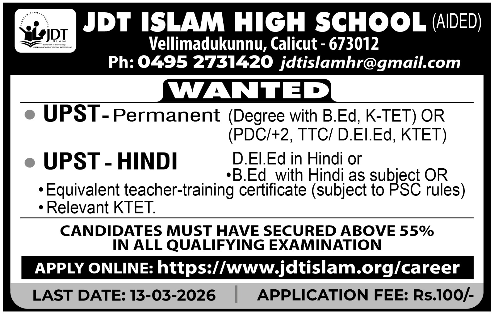 JDT Islam High School in Vellimadukunnu, Calicut, is looking to hire teachers for the following positions:
